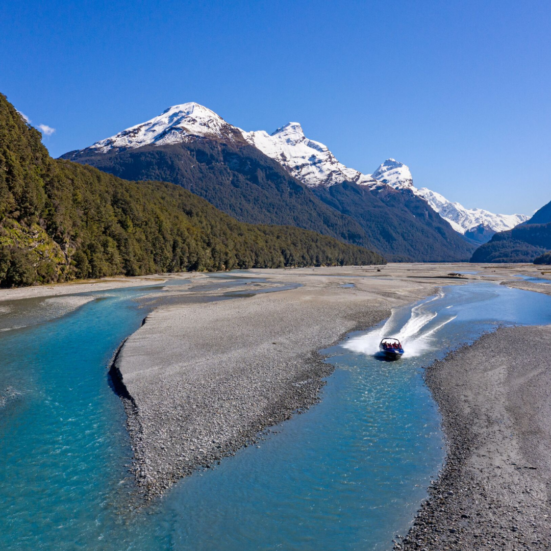 In the afternoon, you’ll embark on a thrilling 2-hour jet boat ride into Mt Aspiring National Park and Te Wāhipounamu UNESCO World Heritage Area. The expert drivers will share fascinating stories about the area’s history, Māori legends, and unique flora and fauna as we cover 90km of crystal-clear river.