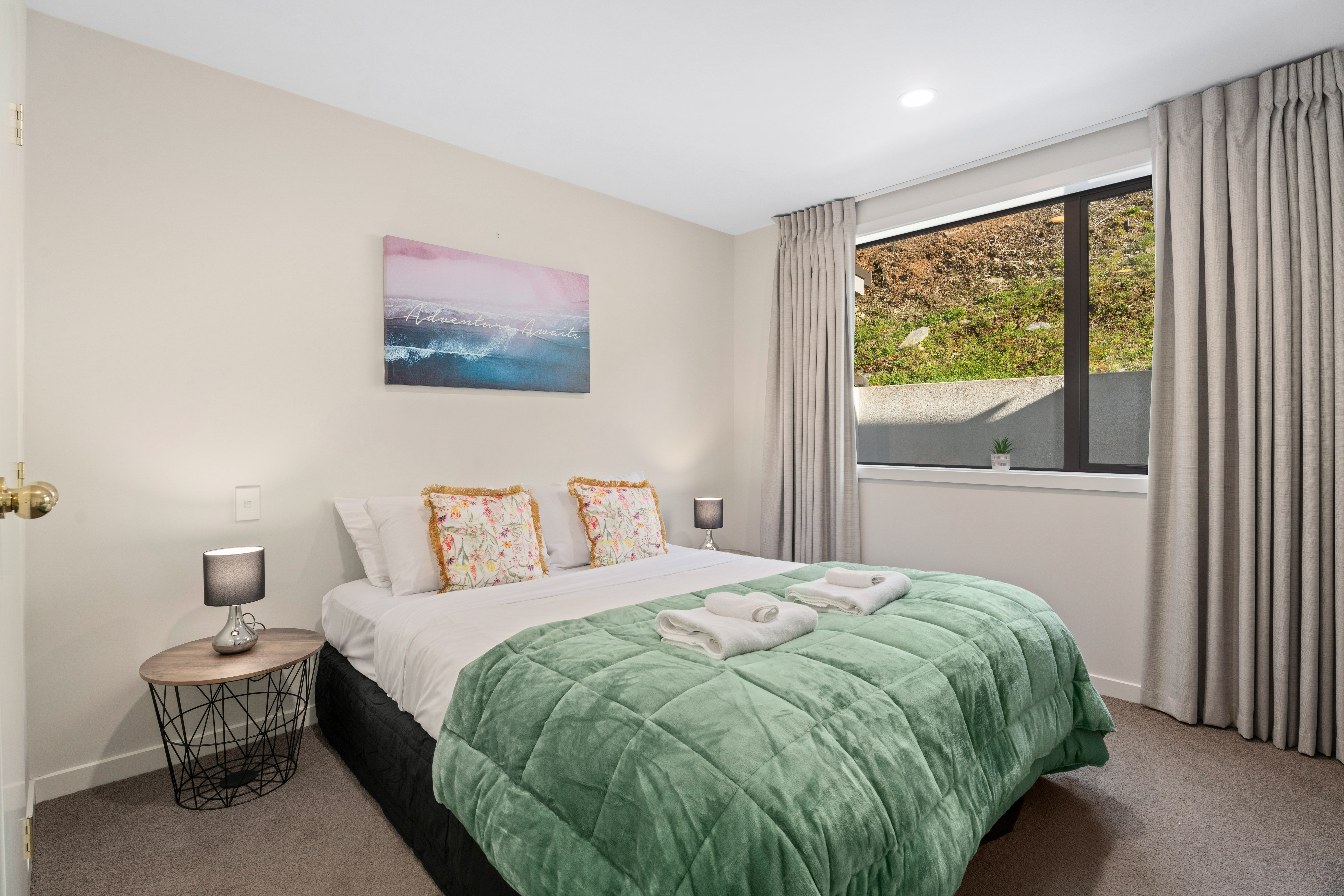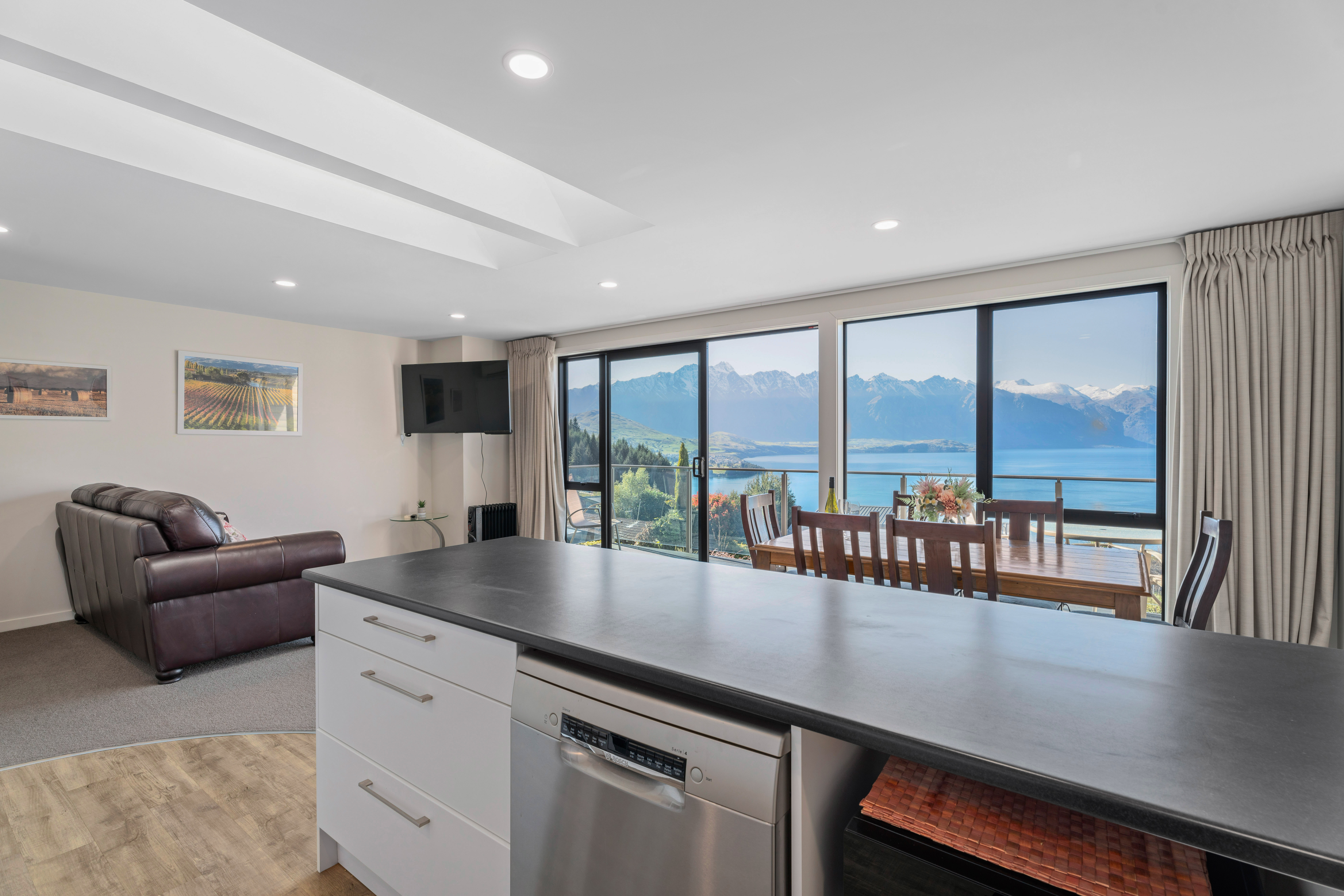 Our home is large and spacious, with an open plan in the living and dining areas. The lounge/kitchen areas, and two of the bedrooms enjoy spectacular views of Lake Wakatipu, The Remarkables and the mountains of the Southern Alps.