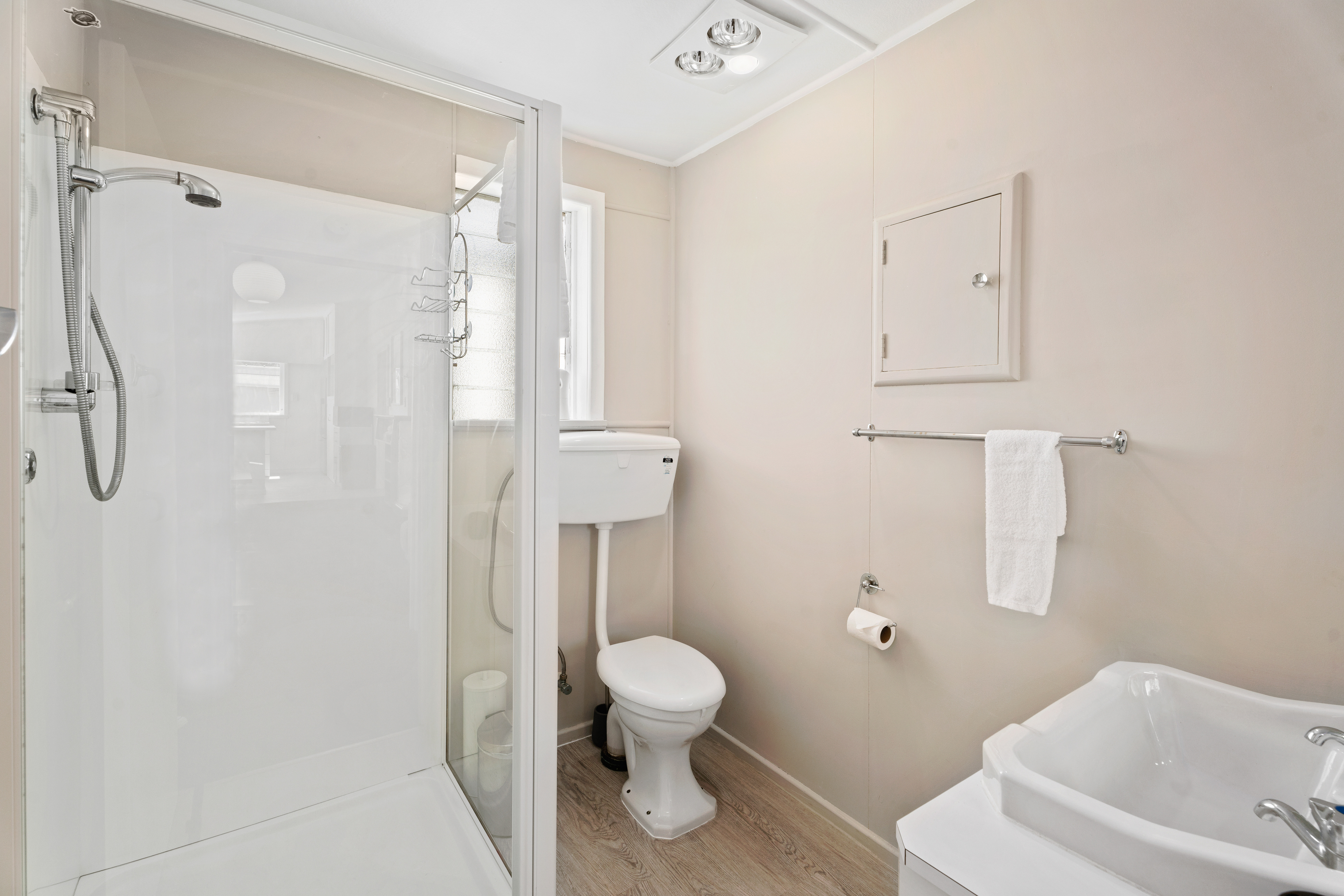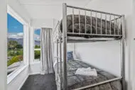 Bedroom two features two single beds which can be zipped together into a super king size bed on request. Bedroom three features a bunk bed with two single size beds. The bunk bed frame is a commercial grade steel frame, designed for adults. It is rated to support 100kg per bed (200 kgs max). Between the bedroom two and three is the second bathroom, featuring a shower, toilet and basin. Both bathrooms have heat lamps for warmth. There is a large air conditioning unit (heat pump) in the main living room and each bedroom has additional heaters if required.