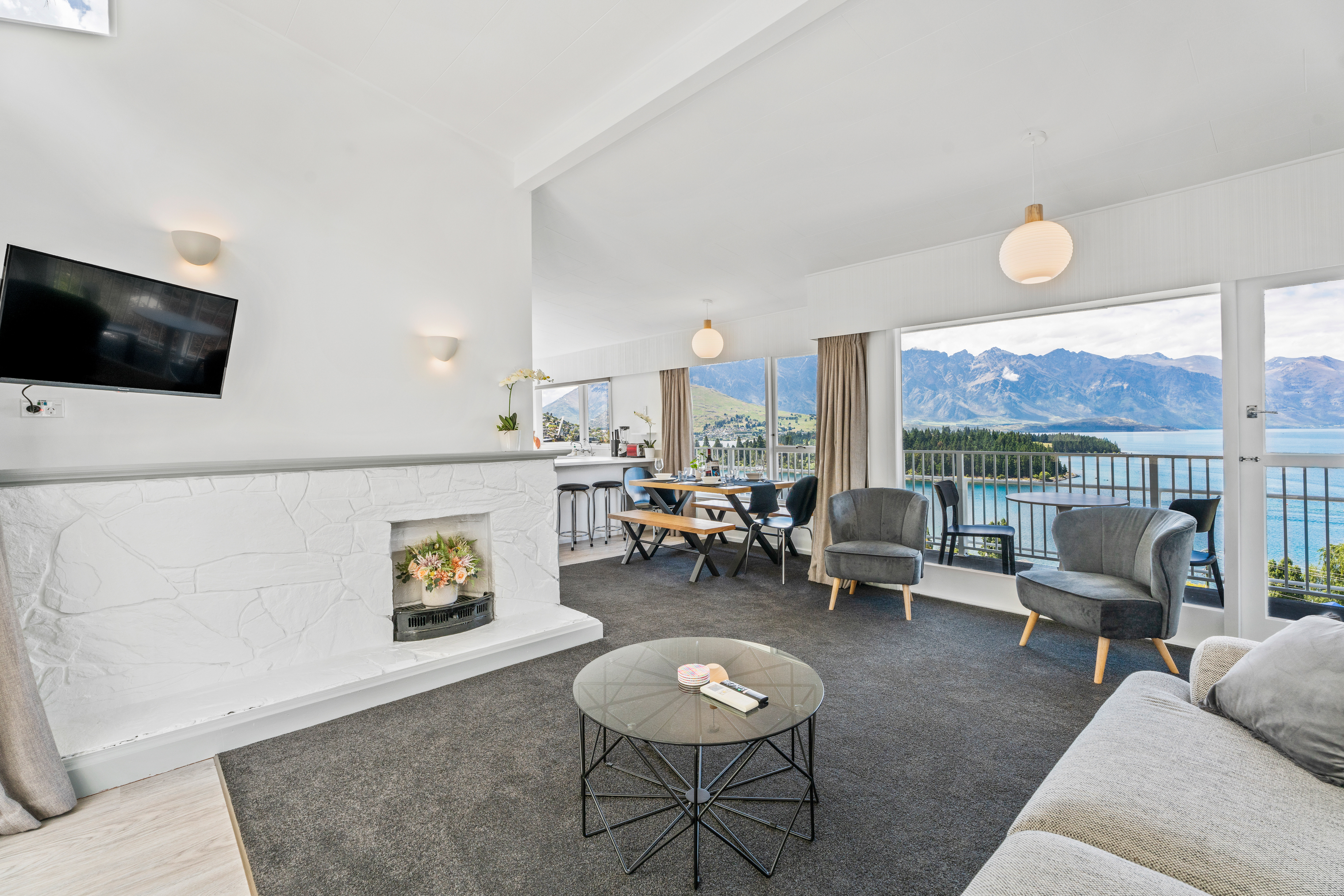 The uninterrupted views of Lake Wakatipu and the Remarkables Mountain range are truly the best you will find in Queenstown. You can enjoy them from most rooms in the house as well as out on the balcony. The house has a level driveway and can accommodate at least three cars. The driveway is reasonably long so can also accommodate larger camper vans. The living room has a 50 inch, internet enabled tv. The house has high speed fibre wi-fi.