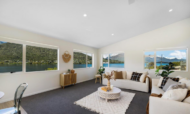 The living room offers ample space with cozy seating options and panoramic views of the Remarkables Mountain Range and Lake Wakatipu. Experience the breathtaking colors of the sky changing throughout the day, while you unwind on the large, comfortable couches with a glass of exquisite local NZ wine and enjoy entertainment on the 50-inch internet-connected TV.